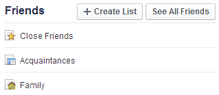 By default, Facebook has a couple of lists that you may find useful, such as Close Friends, Acquaintances, Family and the city you live in.